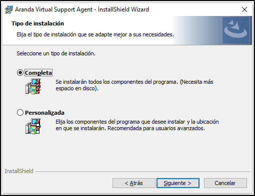 ⚐ Note: Installing the agent generates different Aranda Virtual Support processes and services.