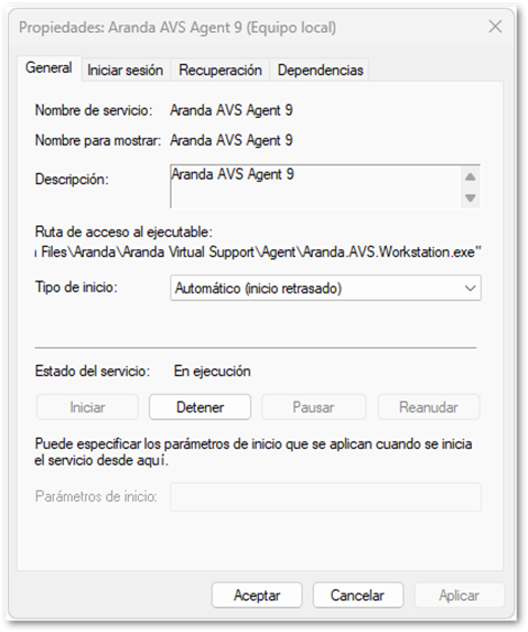 This service is launched by the service of the executable “Aranda.AVS.Workstation.exe”, so its startup must be manual.