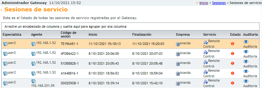 Você tem a oportunidade de visualizar as sessões de serviço (controle remoto e transferência de arquivos).