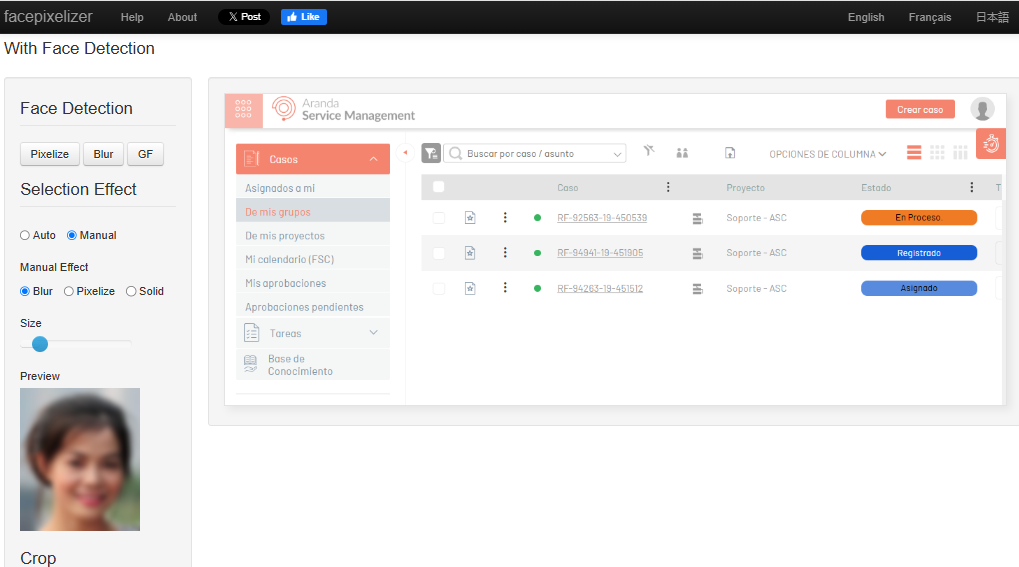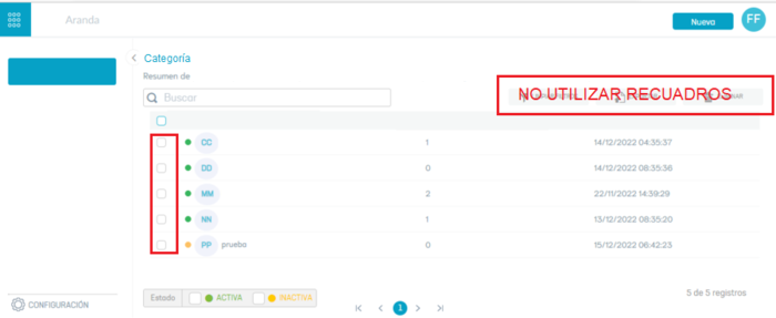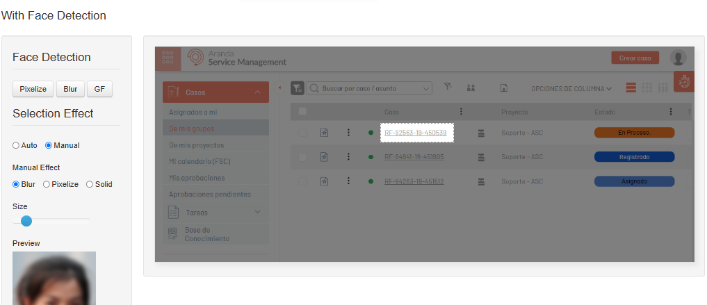 Si la información registrada en pantallas utilizadas para ilustrar y describir una funcionalidad del producto, tienen información sensible para el cliente o para Aranda, se podrá difuminar la información relevante.