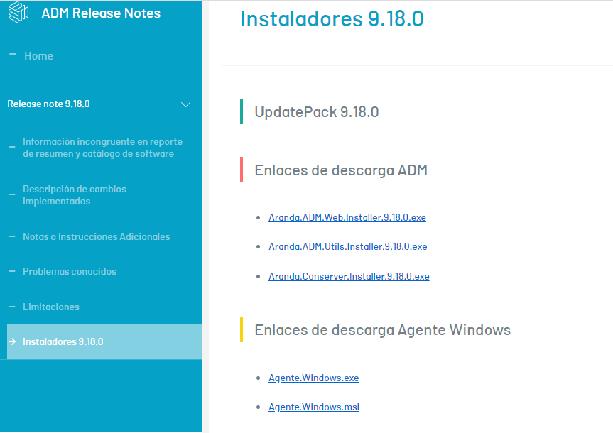 | Instaladores | Esta categoría incluye el enlace del instalador o instaladores de la versión del producto liberado. Aplica para los productos OnPremise. |