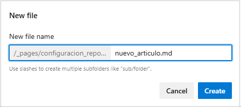 - El nombre del artículo debe tener la extensión “.md” (markdown) para ser reconocido al publicar el manual.