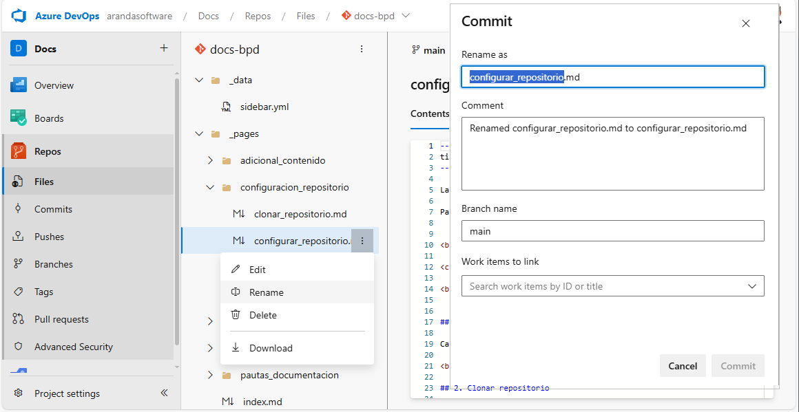 2. En el menú encabezado seleccione el repositorio del proyecto/manual en curso. Ejemplo docs-bpd.