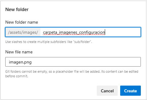 7. Para renombrar una carpeta de imágenes, en la vista de información seleccione la carpeta assets y una carpeta creada; en la opción more options, seleccione rename. Se habilita la ventana para actualizar el nombre de la carpeta. Actualice el nombre y en la ventana que se habilita haga clic en el botón Commit.