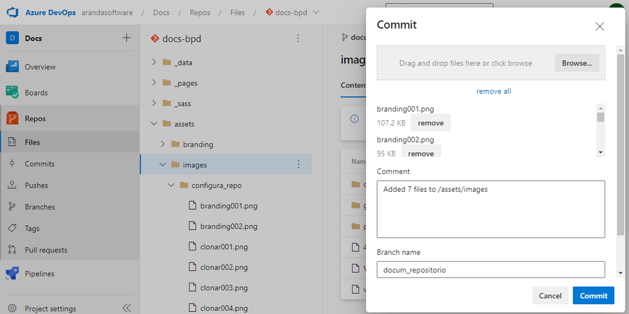 4. En la ventana que se habilita seleccione la imagen o imágenes que requiere agregar al proyecto y haga clic en el botón Commit para guardar los cambios propuestos.