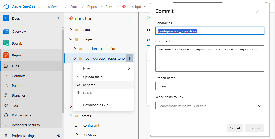 ⚐ Nota: Antes de modficar la carpeta, cree una rama para registrar los cambios. Ver creación de Ramas en un Proyecto