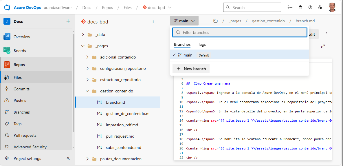 1. Ingrese a la consola de Azure DevOps, en el menú principal seleccione la opción Branches (ramas).