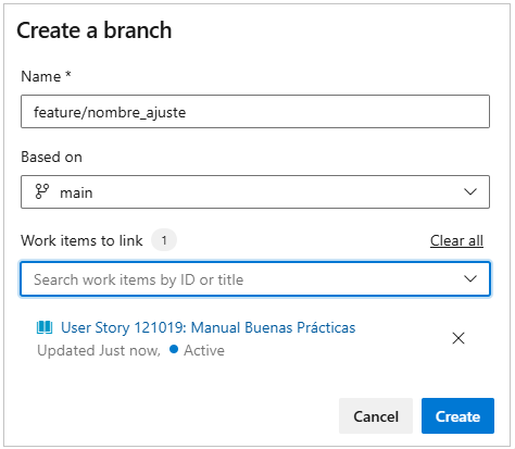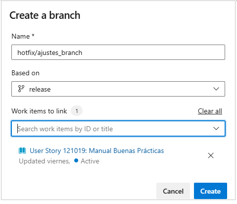 4. Se habilita la ventana Create a branch, donde podrá dar un nombre a la rama, definir su rama base y asociar uno o varios Work items.