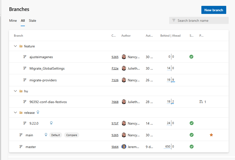 2. En la vista detalle de ramas, en la parte superior de la consola, seleccione la opción All donde podrá crear nuevas ramas o ver la estructura creada para tipos de ramas como feature, hu, release, main.