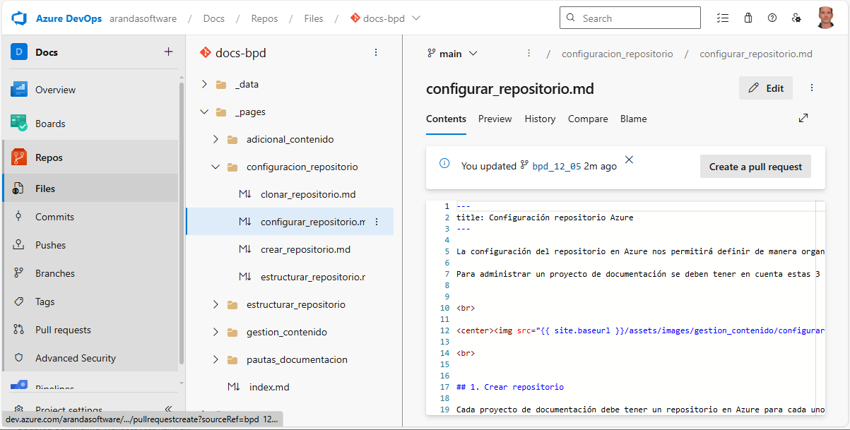 1. Después de realizar cambios o actualizaciones en la documentación del proyecto (carpetas, imágenes, artículos, archivos), en la vista de información del repositorio se habilita la opción Create a pull request. Seleccione esta opción para iniciar el proceso de enviar los cambios asociados a la rama creada y unificar la información en la rama base (main, feature/ o release/).