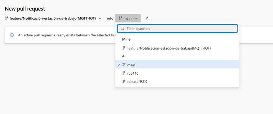 4. El Pull Request queda en espera de corrección y aprobación. El sistema validará que no existan conflictos durante la unificación