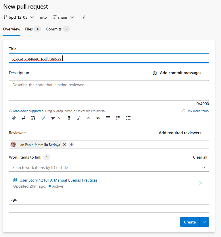 3. En la ventana New Pull Request complete los datos de la actualización: título, descripción (opcional), asignar a los usuarios encargados de revisar los cambios y relacionar el o los Work Items. Al finalizar seleccione el botón Create