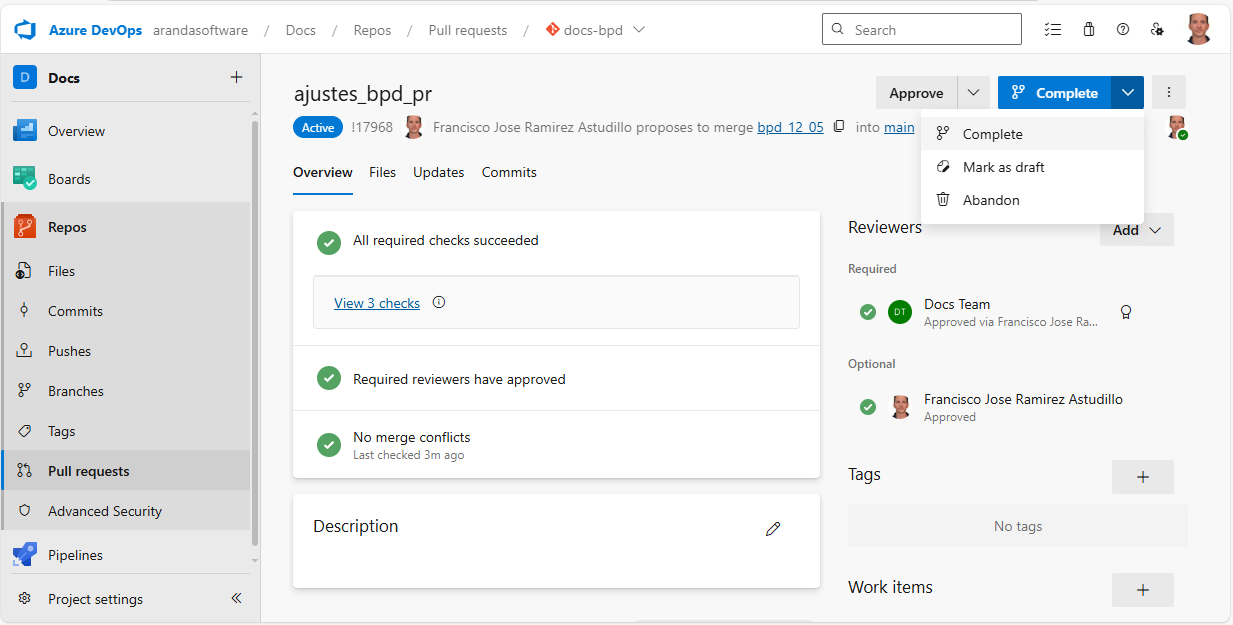 5. Cuando el proceso de comprobación sea exitoso, seleccione el botón Complete en la parte superior de la consola de Azure DevOps. En el menú desplegable, seleccione Complete.