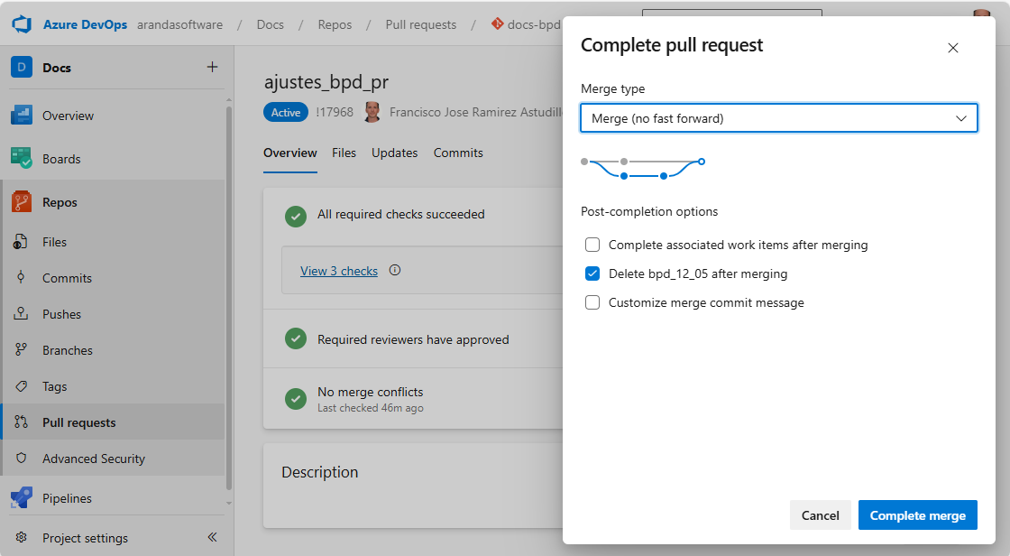 6. Se habilita la ventana Complete Pull Request donde debe unificar la información en la rama base. Mantener marcadas las opciones de Complete y Delete.
