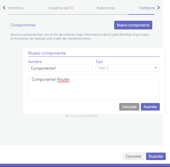 8. In the CI detail view, select the Components to include components that are part of the IC. To add a component to the CI click the New Component and enter the requested information such as Name, Type, and Description of the component, to add it by clicking the Save.