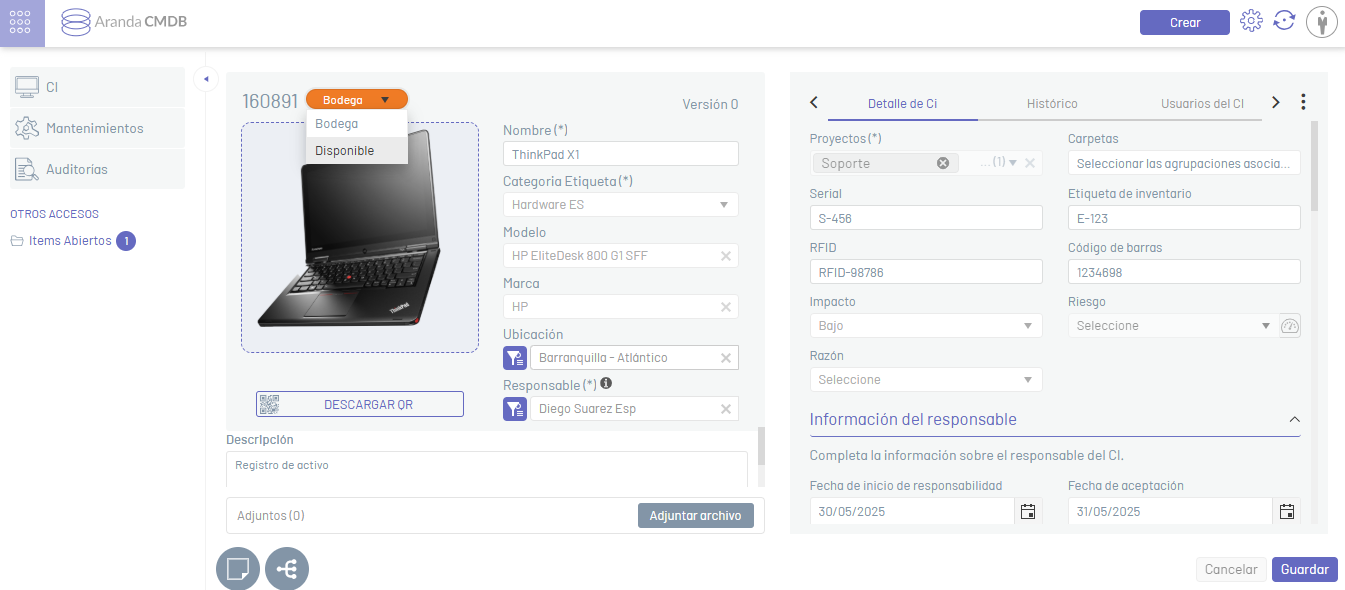 3. When you finish editing the CI, click the Save to confirm the changes made or on the Cancel to dismiss the change and keep the last saved information of the IC.