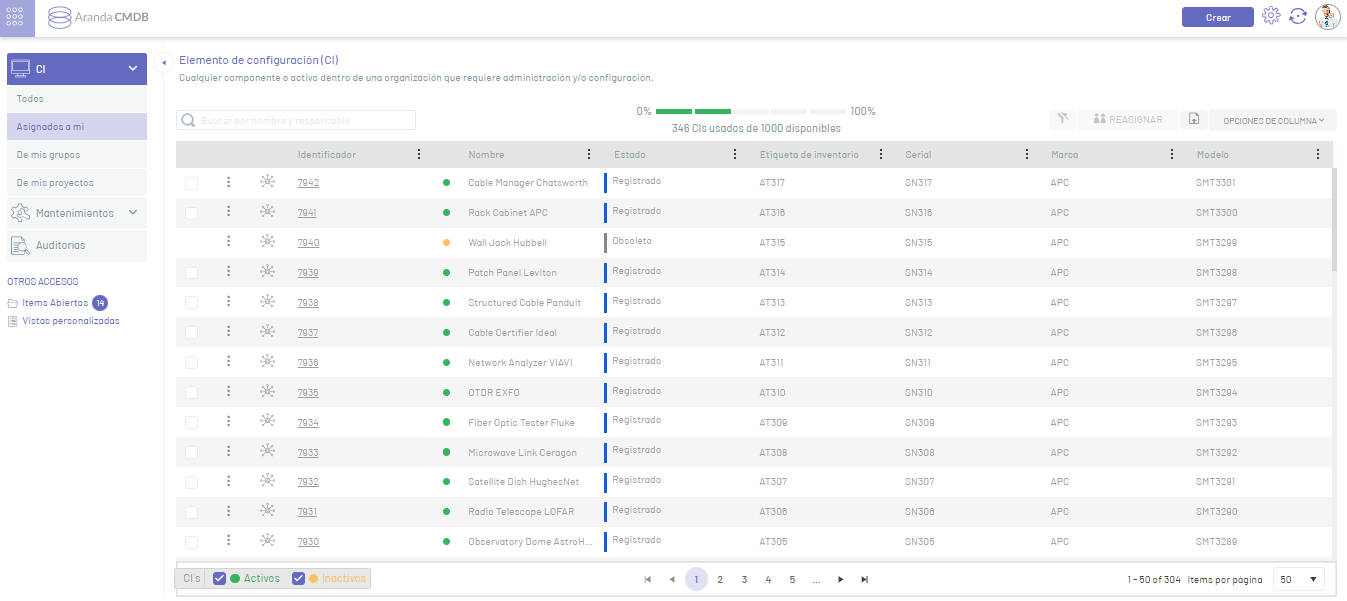 | Asignados a mi: | En esta opción se listan los cis en los que el usuario en sesión es responsable. |
