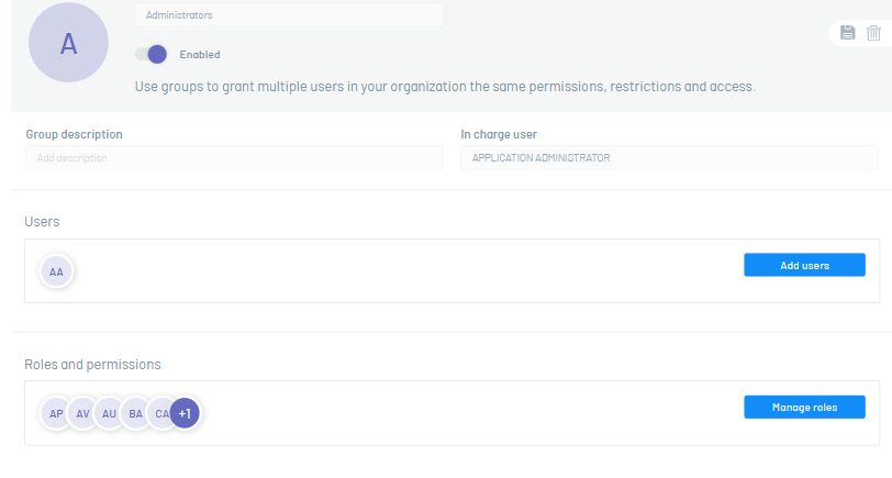Ejemplo: Si el perfil de usuario no tiene los permisos de edición de grupos, el botón Guardar y las cajas de texto se encuentran deshabilitados