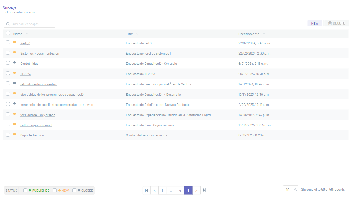⚐ Nota: Al guardar la encuesta queda en estado Nueva, el cual podrá cambiar entrando a la encuesta para publicarla y enviarla a los usuarios.