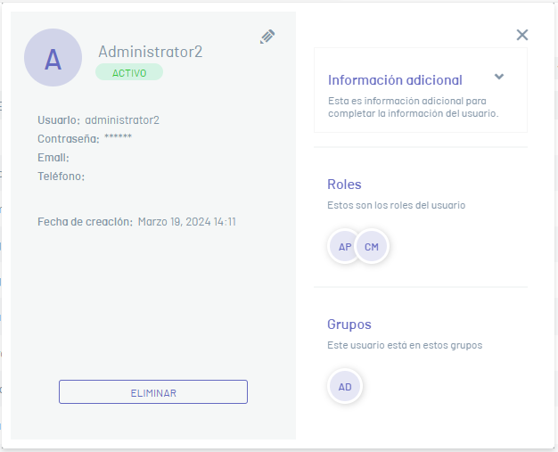 ⚐ Nota: Somente usuários do provedor Aranda podem ser modificados. Os usuários importados permitem apenas associar e desassociar funções, modificando os campos de estado, idioma e fuso horário.