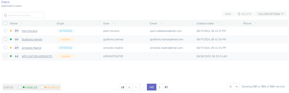 Exemplo: Se o perfil de usuário não tiver as permissões de edição e exclusão, o Novo e Eliminar será desativado.