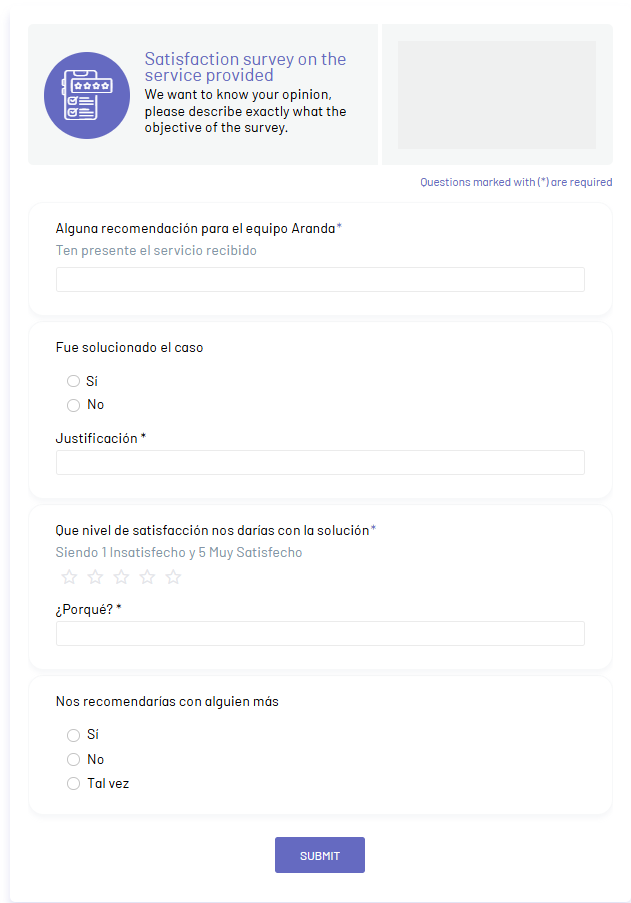 | Classificação | É a questão em que o cliente pode enviar um nível de classificação. Na administração da pesquisa, a faixa de classificação máxima é configurada. |
