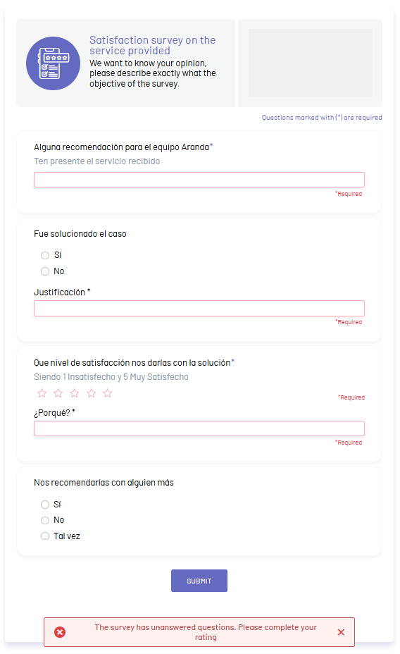 3. Se o cliente não responder às perguntas marcadas como obrigatórias e clicar no botão Enviar pesquisa O formulário destacará os campos pendentes a serem respondidos e você poderá exibir uma mensagem de erro com o texto A pesquisa tem perguntas sem resposta. Por favor, termine sua classificação.