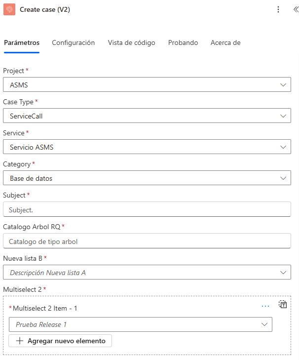 - Los campos adicionales requeridos en ASMS se mostrarán como campos obligatorios en el conector. Ejemplo: