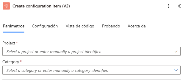 2. Escriba o seleccione un valor para las propiedades “Project” y “Category”.