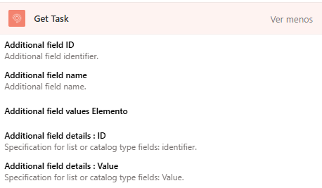 | Additional Fields | additionalFields | array | Campos adicionales de la tarea, según el caso recuperado |