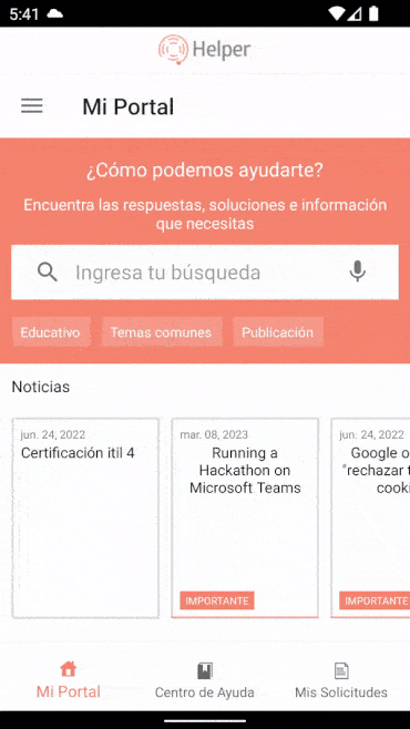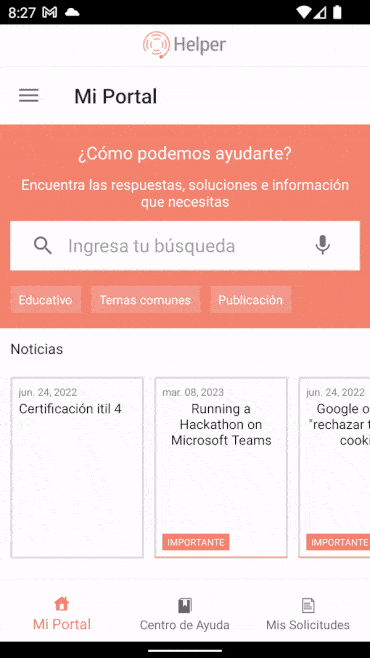 4. On the taskbar of the Aranda Helper mobile console, select the My Portal and in the Enter your search field you can consult the cases and/or articles by entering the keywords. You can also search using the filters Cases and Articles when applicable in the results.