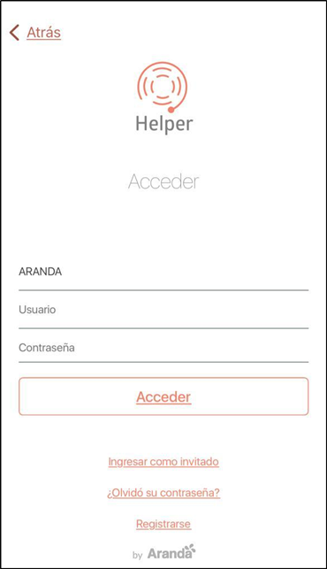 1. Na tela de login do Aranda Helper, o usuário poderá autenticar e validar o sistema inserindo os seguintes dados:
