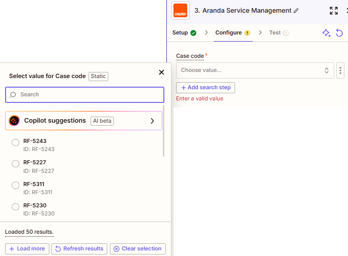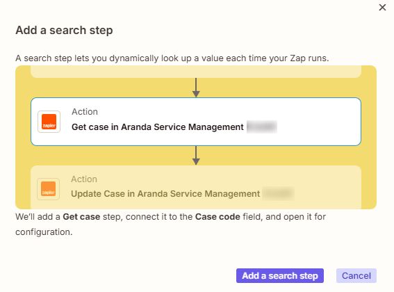 Agregue un paso de búsqueda o seleccione un caso de la lista